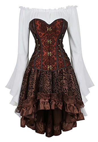 Steampunk Corset 3 Piece Outfits corset kvinnor Waist Bustiers kjol Vit Blouse Set pirat kostym Brun M