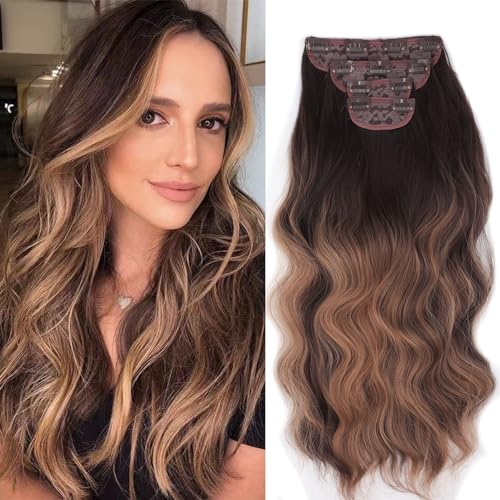 Gairyan Clip i förlängningar som äkta hår, billiga hårstycken, 4 delar, set 55 cm, hårförlängning, hårdelar, klämma i hårförlängning, syntetisk vågig lång lockig, brun ombre, karamellblond