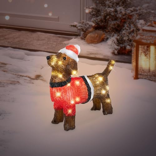 ECD Germany LED-julhund tax med mössa och jumper, 37x34 cm, trädgårdsfigur med 40 varmvita lysdioder, IP44, inomhus/utomhus, hundfigur i akryl, julfigur julbelysning juldekoration