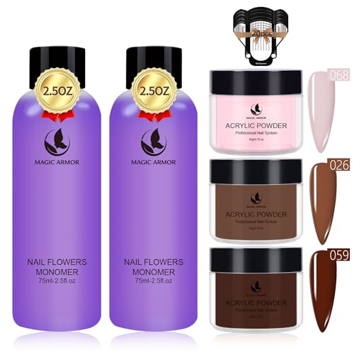 MAGIC ARMOR Akrylpulver och akrylvätska kit, låg lukt akrylvätska för naglar, 3st brun Series Akrylpulver Ingen UV-härdning krävs, 2 × 75ml Akrylvätska monomer Hög kapacitet Salon kvalitet Nybörjare