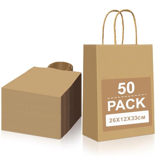 Gucass Stora papperspåsar med handtag, 50 st., bruna presentpåsar, kraftpapperspåsar, papperspåsar, för förpackning, shopping, födelsedagsfest, bröllop, jul och halloween, 26 x 12 x 33 cm