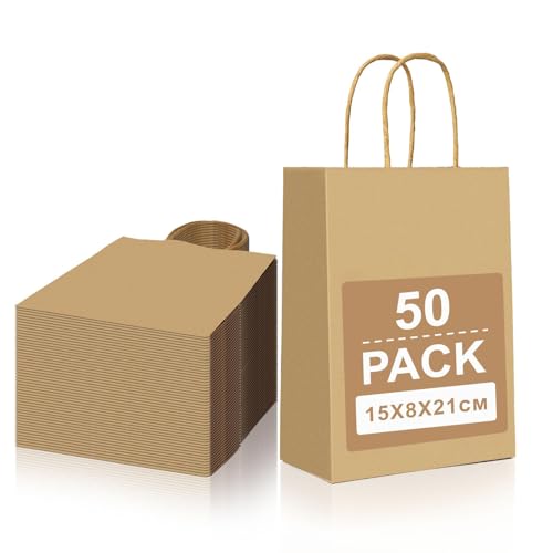 Gucass Små papperspåsar med handtag, 50 st., bruna presentpåsar, kraftpapperspåsar, papperspåsar, presentpåsar för förpackning, shopping, födelsedagsfest, bröllop och jul, 15 x 8 x 21 cm