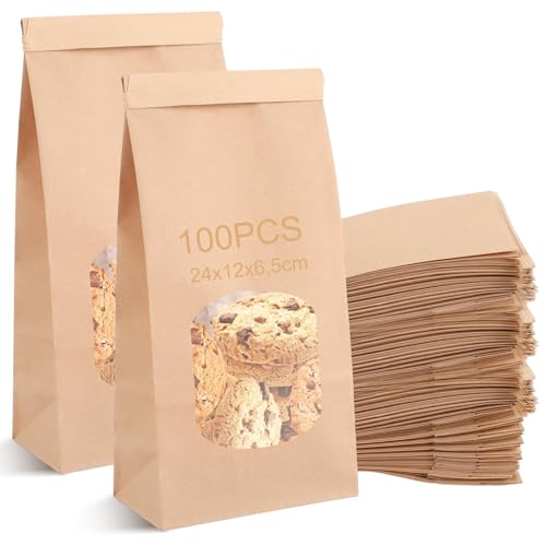 YAYODS 100 st. papperspåsar med fönster – 24 x 12 x 6,5 cm kraftpapperspåsar små – papperspåsar bruna med stängning – brödpåsar papper för kex, bröd, smörgåsar, godis, kaffebönor