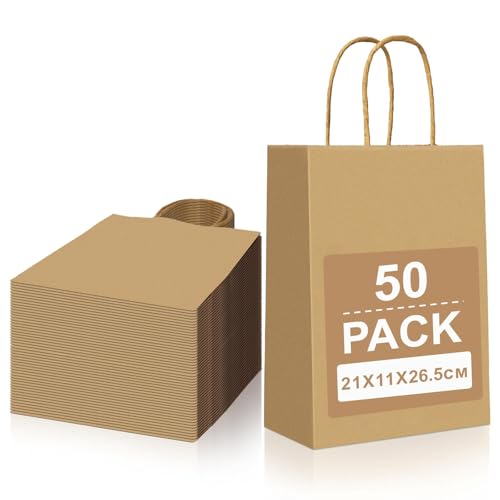 Gucass Medelstora papperspåsar med handtag, 50 st., bruna presentpåsar, kraftpapperspåsar, papperspåsar, för förpackning, shopping, födelsedagsfest, bröllop, jul och halloween, 21 x 11 x 27 cm