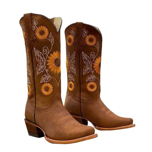 BERULL Western cowboystövlar för kvinnor bred vad låg klack slitna cowgirlstövlar höst stövlar för kvinnor mitten av vaden cowgirl västerländska stövlar solros broderi sydda tossor, Brun, 40 EU