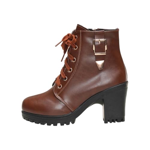 Stövletter dam med klack av konstläder för snörning – ankelstövlar kort skaft hoppstövlar blockklack läderstövlar platå gotiska stövlar rockig biker kängor vintage ankelskor, BRUN, 38 EU