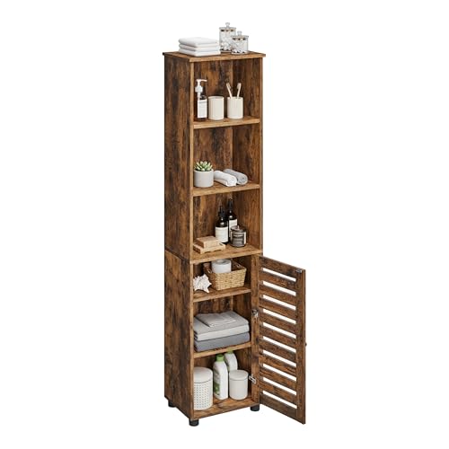 Relaxdays badrumsskåp med dörr, HBT: 167 x 30 x 40 cm, 6 fack, toalettskåp, högt, smalt, badrum högskåp, brunt