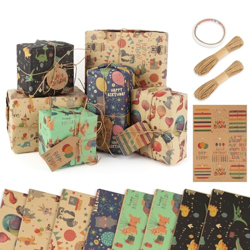 8 stycken kraft presentpapper rulle, 70 x 50 cm tecknade djur med tejp och snöre för barn, män, kvinnor, flickor, pojkar