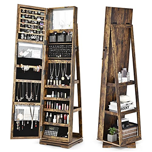 GOPLUS 3-i-1 smyckesskåp med spegel, stående spegelskåp, 360° roterbart, låsbart, stående spegel, smycken, arrangör med stort förvaringsutrymme och förvaringsfack för sovrum (brun)