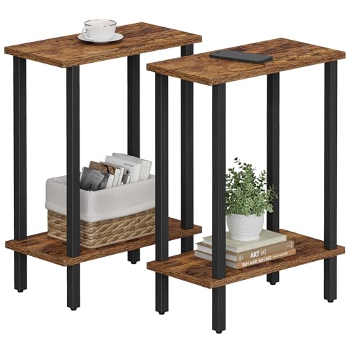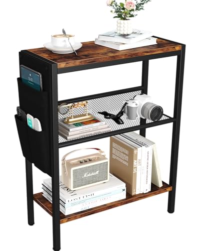 Yusong Litet smalt sidobord för små utrymmen, smalt bord med förvaringsväska, soffsnacksbord med justerbart metallnät, 3 nivåer accent-smala sidobord för vardagsrum och sovrum, rustikt brunt