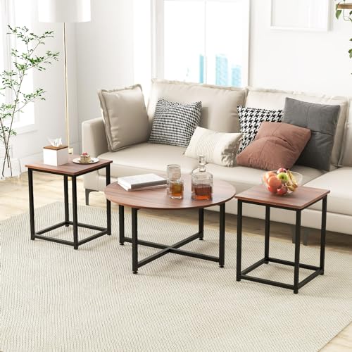 COSTWAY Uppsättning av 3 soffbord, sidobord metallram, 1 runt soffbord & 2 fyrkantiga bord, soffbord vardagsrumsbord soffbord modern, satsbord för vardagsrum sovrum (brun)