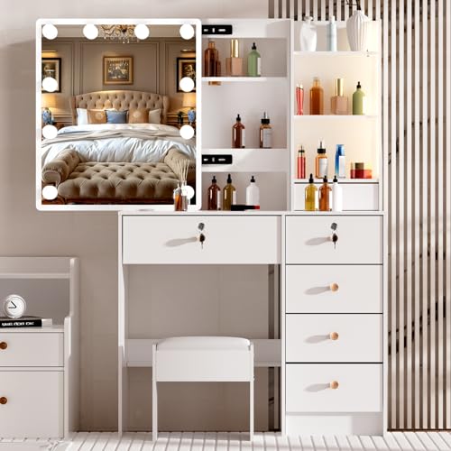 Ereousa Sminkbord med Spegel och LED-belysning, Toalettbord med 6 Lådor, 3 Hyllor och 3 Dolda Hyllor, Sminkbord Modernt för Sovrum, Kosmetikbord med Brunt Handtag Vänster, vit