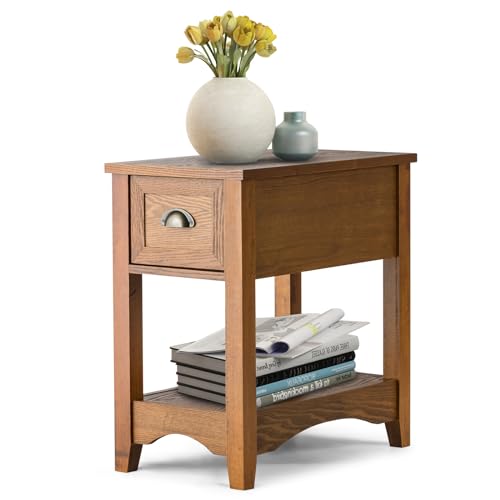 GIANTEX Retro sidobord med låda och öppen hylla, Rektangulär nattduksbord med Massiza Trä ben, Smal för små utrymmen,Vardagsrum,Sovrum (Brun, 1)