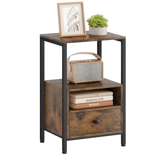 FAVOOSTY Nattduksbord med låda, öppen förvaringshylla, enkel montering, för sovrum, vardagsrum, kontor, trä, rustikt brunt - sidobordsmöbler, högt nattduksbord byrå