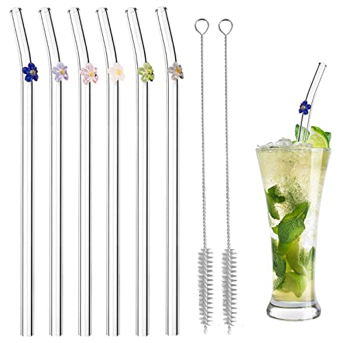6 stycken glassugrör återanvändbara, böjda sugrör design med färgglada blommor, böjda sugrör glas, med 2 rengöringsborstar, för Bubble Tea, Slush, cocktail, juicer