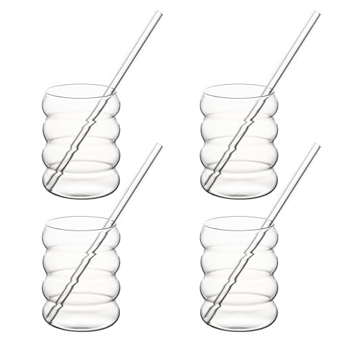 Pgtc 530 Ml Bubble Glas Med SugröR, Set Med 4 St Ribbade Dricksglas,VåGglas,Tumbler-Glaskoppar,Vattenglas för Latte Macchiato,Iskaffe,Whiskycocktails,Yoghurt,LäSk,Kaffe