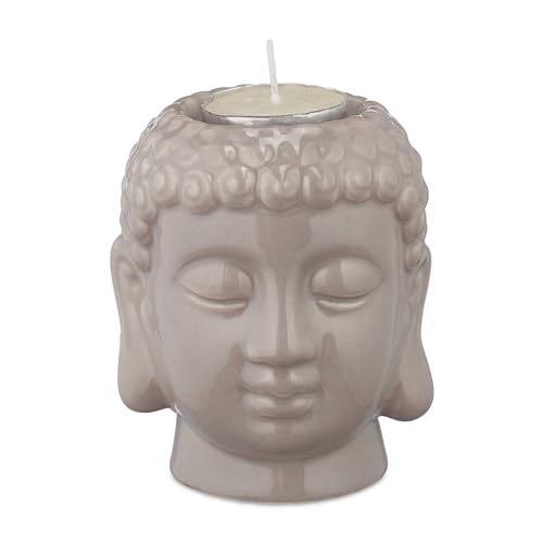 Relaxdays Buddha Värmeljushållare, keramik, Buddha-huvud för värmeljus, zendekoration för vardagsrum och badrum, Feng Shui, dekoration, grå