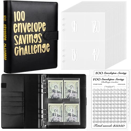 LingLingo 100 kuvert pengabarsparande utmaning bindemedel, enkelt och roligt sätt att spara $5 050, A5 budgetbok med kontanter kuvert kit, svart (svart, guld)
