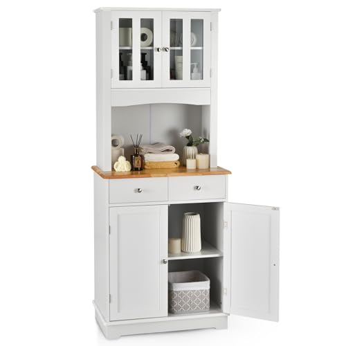 COSTWAY Köksskåp högt, 170 cm bufféskåp trä, högskåp med 2 lådor och justerbara hyllor & glasdörrar och trådhål, fristående, buffé för kök, matsal, vit