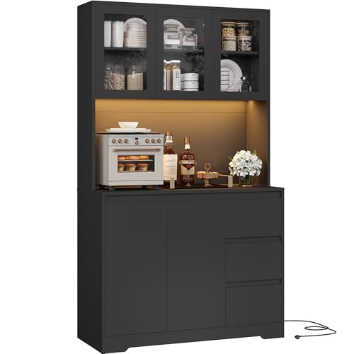 FirFurd Köksskåp, bufféskåp med LED-skänk, för kök med grenuttag, köksskåp med bänkskiva och 3 lådor, köksbuffé med justerbar hylla, 180 x 100 x 38,5 cm (svart)