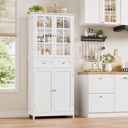 HOCSOK Köksskåp, 180 cm bufféskåp med 2 glasdörrar, högskåp med 4 dörrar och 2 lådor, universalskåp för kök, matsal, vardagsrum, vitt