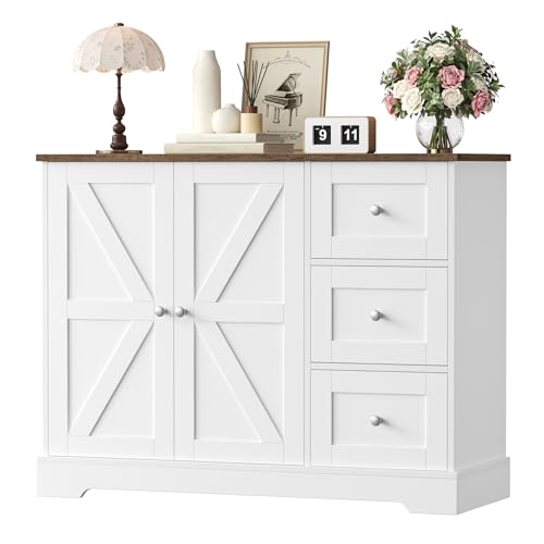 FirFurd Skänk köksskåp med 3 lådor 3 dörrar, köksskåp, bufféskåp för kök vardagsrum matsal, justerbar hylla, 108 x 38 x 98,5 cm vit