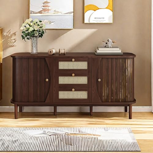 YLSZHY Skänk i trä bufféskåp med 3 rottinglådor, förvaring accentskåp med 2 skjutdörrar, konsolskåp för vardagsrum entré hall (brun)