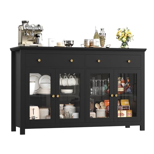 FirFurd Skänk 140 cm brett köksskåp med bänkskiva skänk för kök vardagsrum bufféskåp med 2 lådor och 4 glasdörrar köksbuffé med justerbar hylla 140 x 90,7 x 40 cm (svart)