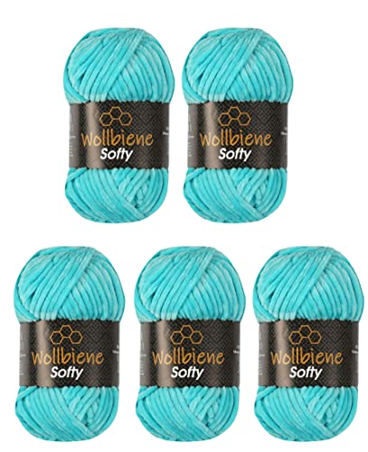 Ullbi Softy 5 x 100 gram chenillull för virkning ull för stickning, babyull, 500 gram chenille-ull, super bulky crochet garn (cerulean blå 38)