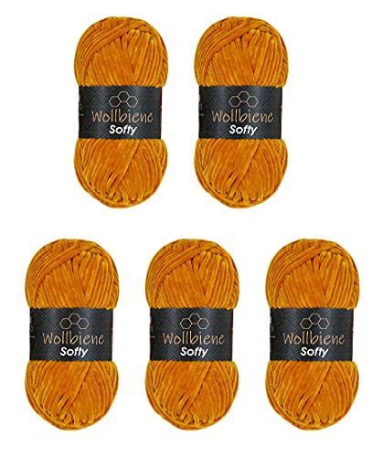 Ullbi Softy 5 x 100 gram chenillull för virkning ull för stickning, babyull, 500 gram chenille, ull, super bulky crochet garn (guld 82)