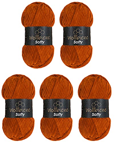 Ullbie Softy 5 x 100 gram chenillull för virkning ull för stickning, babyull, 500 gram chenille-ull, super bulky crochet garn (karamell 08)