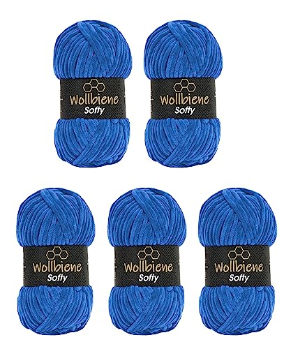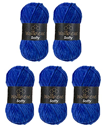 Ullbi Softy 5 x 100 gram chenillull för virkning ull för stickning, babyull, 500 gram chenille, ull, Super Bulky Crochet Garn (blå 03)