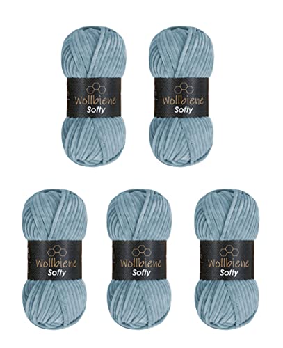 Ullbi Softy 5 x 100 gram chenillull för virkning ull för stickning, babyull, 500 gram chenille, ull, Super Bulky Crochet Garn (blå sten 011)