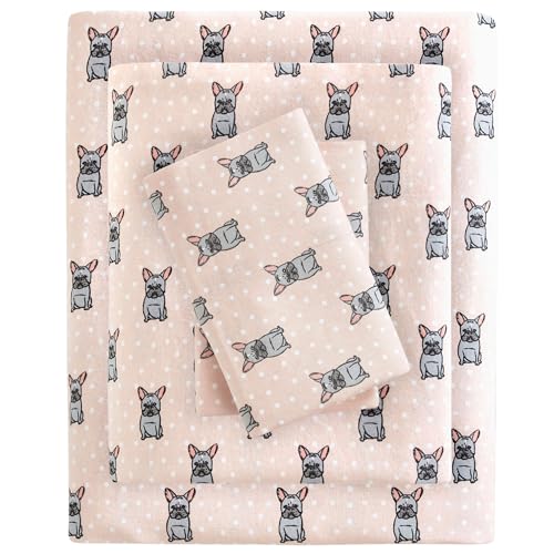 True North by Sleep Philosophy Cozy Flannel Warm 100% Cotton Sheet - Novelty Print Animals Stars Cute Ultra Soft Cold Weather Bedding Set, King, Pink French Bulldog 4 Piece
