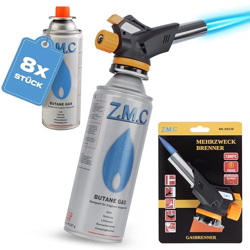 Z.M.C Gasbrännare 1,3 kW + 8 x gaspatroner 227 g, flambrännare upp till 1 300 °C, bunsenbrännare lödbrännare med piezotändning, köksbrännare med justerbar låga, temperatur på 1 300 °C