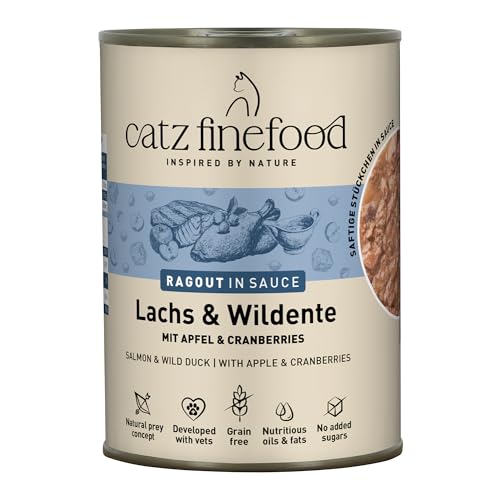 catz finefood Ragout N° 605, lax & anka kattmat våt – finmat, våtfoder för katter i sås utan spannmål och socker med hög kötthalt, 6 x 380 g burk