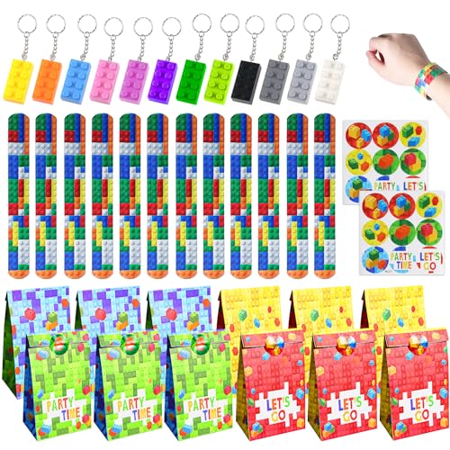 12 uppsättningar födelsedagskalasväskor med byggklossar, festgåvor för barn, byggblock nyckelringar, presentpåse, klistermärken, Pat ringsouvenirer