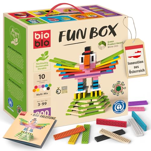 Bioblo Fun Box Multi-Mix med 200 byggklossar | Hållbara byggklossar för barn från 3 år | Träbyggklossar för barnleksaker | Montessori träbyggklossar
