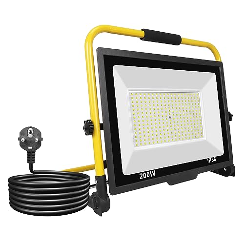 HENGMEI LED byggspotlight, 200 W, kall vit, arbet, bygglampa, arbetsstrålkastare, strömkabel, strålkastare IP66 strålkastare strålkastare, strålkastare, ljus för trädgård, garage (typ A)