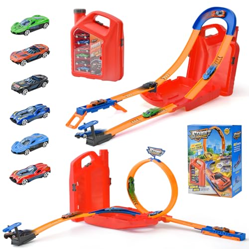 LTFIOON Bilbana för barn, billeksaker med 6 billooping track, förvaringslåda, bärbara leksaker bilbana, bilbana byggsats för barn från 3 4 5 6 7 8 år (röd)
