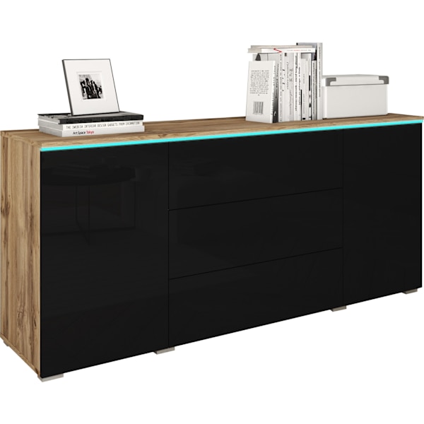 Modern byrå 150 cm, 3 lådor, 2 skåp, Wotan svart högglans