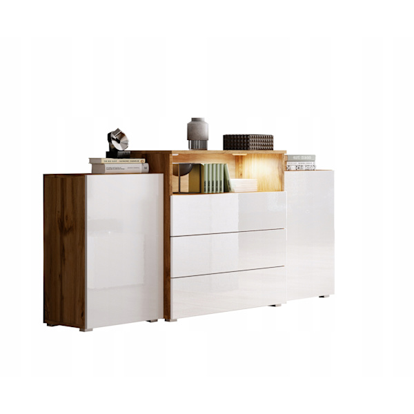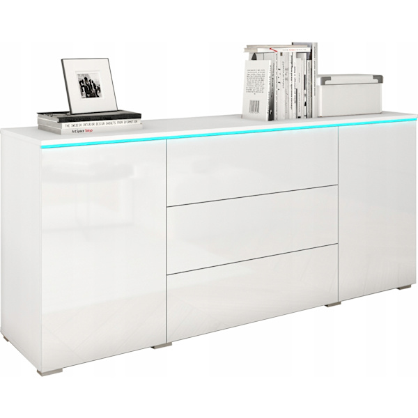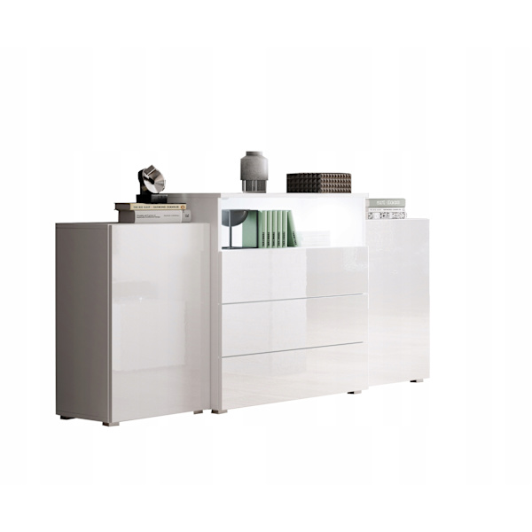 150 cm byrå för vardagsrummet med lådor, sidoskåp och vita högblanka fronter