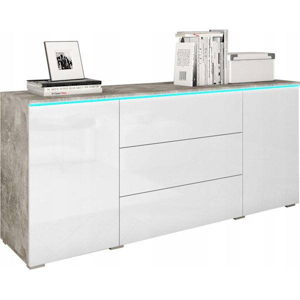 Modern byrå 150 cm för vardagsrummet, 3 lådor, 2 skåp, Betong, Vit högglans