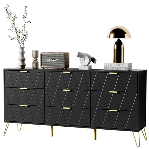 UEV Byrå med 9 lådor, 150 cm, sovrumsförvaring, linjemönster, skandinavisk stil, ärmar och ben i guldfärg, för vardagsrum, sovrum, kontor, 150 x 34 x 74 cm, svart