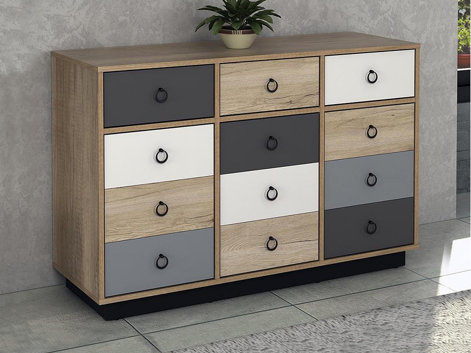Byrå KRYPTON - 3 lådor och 3 dörrar - Färg: ek, vit och grå