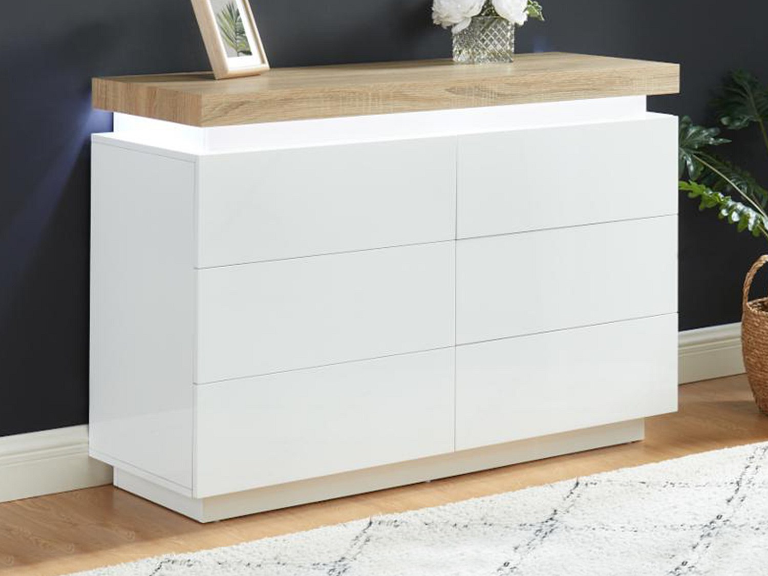 Byrå med 6 lådor i vit lackerad MDF och ek med LED-belysning HALO II