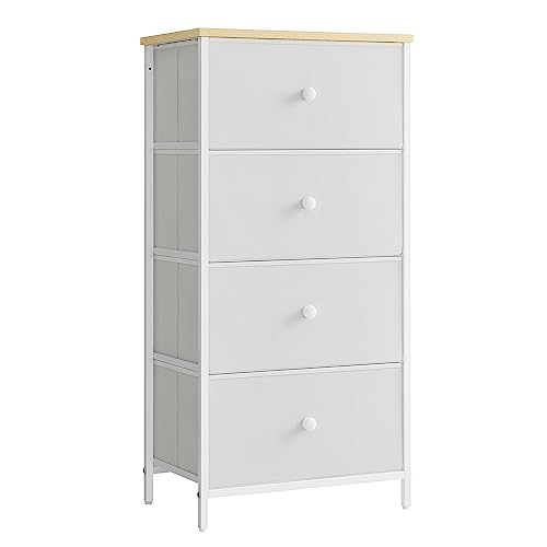 SONGMICS Byrå sovrum, låda förvaringsenhet, byrå med 4 tyglådor, metallram, hög och smal, för garderob, vit och ek LTS314W57