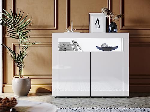 SONNI Byrå vit högglans med LED-belysning, skänk, vit med 2 dörrar 108 cm bred