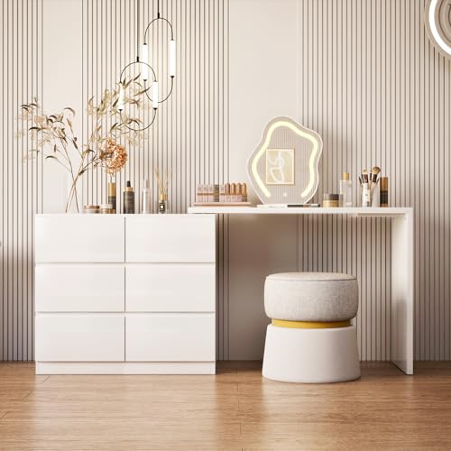 WOLTU Sminkbord med oregelbunden spegel och dimbart ljus, sminkbord med högglansig bänkskiva, 2 lådor och 1 byrå, trä + metall, modern sovrumsmöbler, svart och vitt.