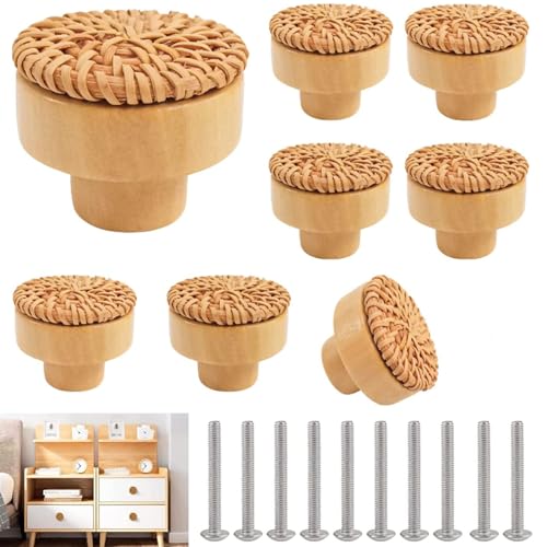RUNEAY Möbelknoppar rotting, 8 stycken, 40 mm skåpknoppar rotting, byrå, lådknappar, möbelknoppar, trä, boho, träknappar, natur, skåphandtag, trä, möbelhandtag, skåp, trähandtag för skåp